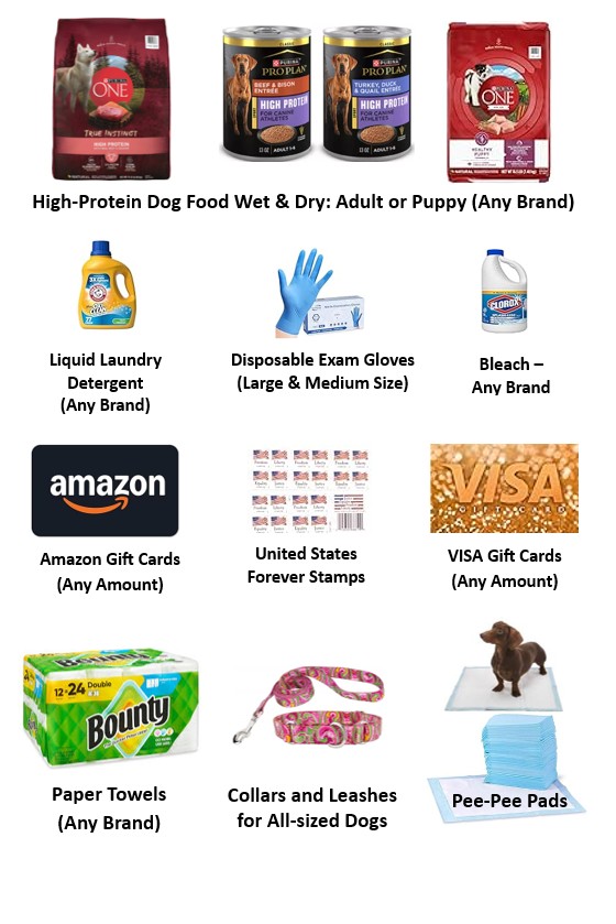 Below is a list of commonly requested items that greatly help dedicated volunteers save lost and abandoned dogs.